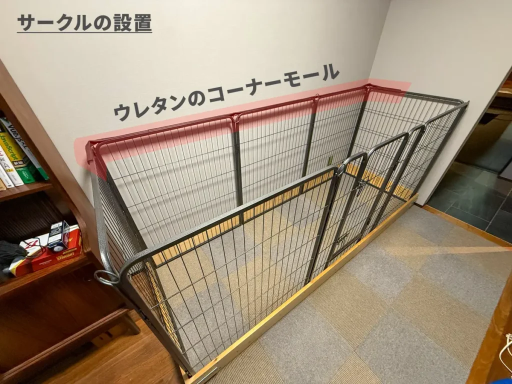 そこで、1×4材で作った枠組の中にサークルを設置します。長辺・短辺をネジで固定し補強に金属のアングルで固定。壁に接する分は壁紙保護のためにウレタンのコーナークッションを設置してます。