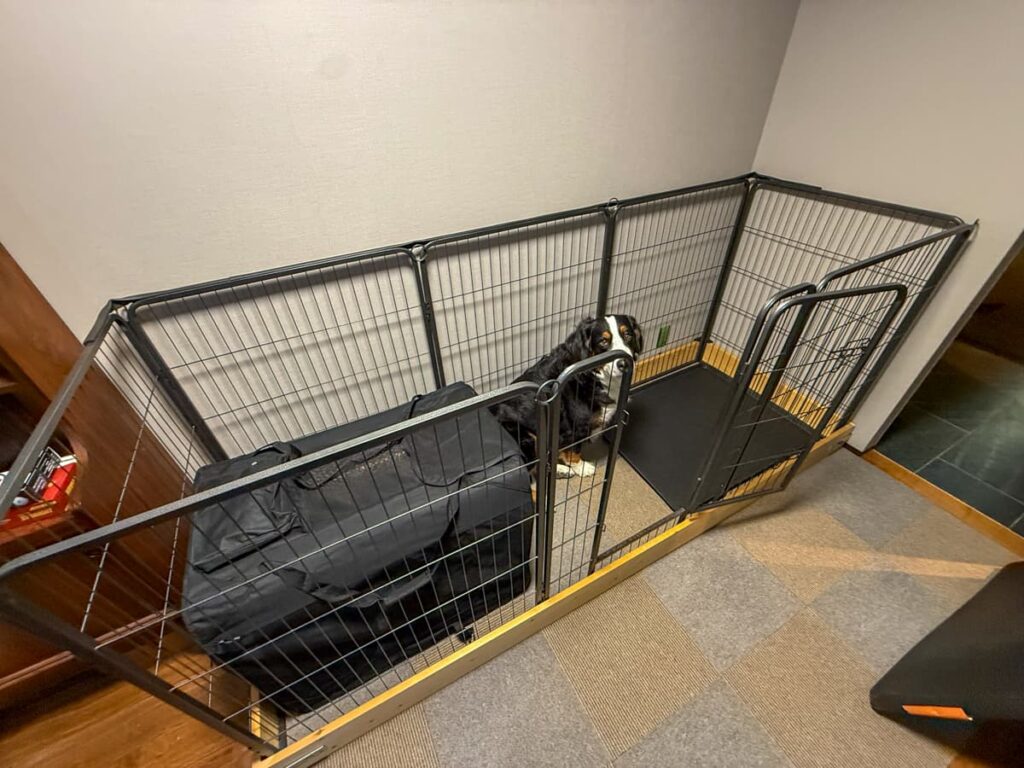 サークルはAmazonで購入した「大型犬用のスチール製サークル」を使用。これもリタのおふる。組み立て式で設置場所に応じて形を変えられるのは便利ですが、大型犬の身体が当たるとすぐに動いてしまうのが難点。