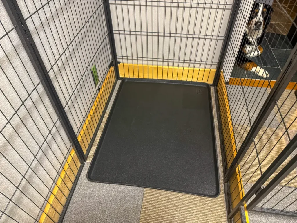 サークル内にトイレ用の「ラゲッジトレイM」と折りたたみ式のクレートを設置すレバ、アーグのサークルスペースが完成です。